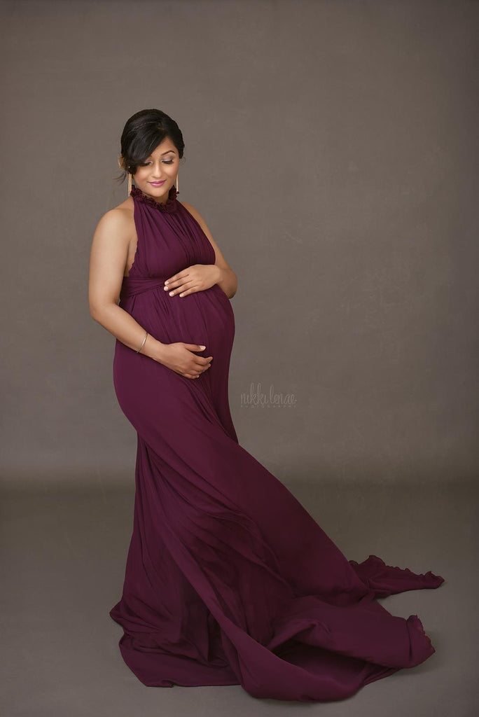 Stunning ruffled turtleneck style gown with vintage flare! The Carolynne gown is long enough to puddle at your feet for draping and tossing. The neck ties can be worn simply tied at the back, or knot and bring back around the waist as a sash. Fully lined for fabulous coverage to use for baby showers, weddings, and non-maternity events!
