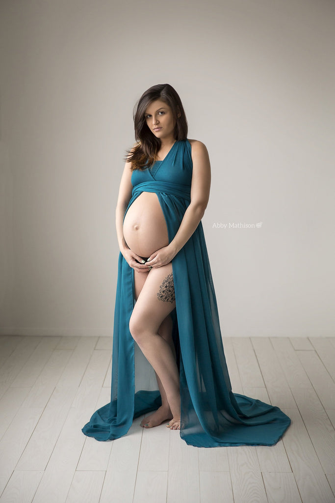 Stunning chiffon skirt with knit infinity top dress made to order with several yards of gorgeous flowing knit material. Split front makes it perfect for your maternity shoot to show off your baby bump, or wear without a split for more coverage, bridesmaids, and senior photo shoots! Over 40 different ways to wrap the top, or flip the dress backwards and wear it as a skirt with the bandeau to show off that cute maternity tummy!