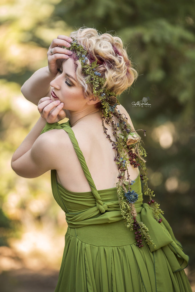 This gorgeous foliage flower crown is a statement piece for the ages, for anyone who loves a completely rustic accent to any special event. The Cora crown boasts an organic style with a full foliage halo with strands of mixed foliage, berries, and flowers mixed in trailing behind for a look all its own. Wear with your hair up to allow the vines to trail down your back, or wear with your hair down for a memorable boho look. This crown is sure to add that special touch of natures magic to your themed photo shoot, wedding, outdoor party, or other special occasion!