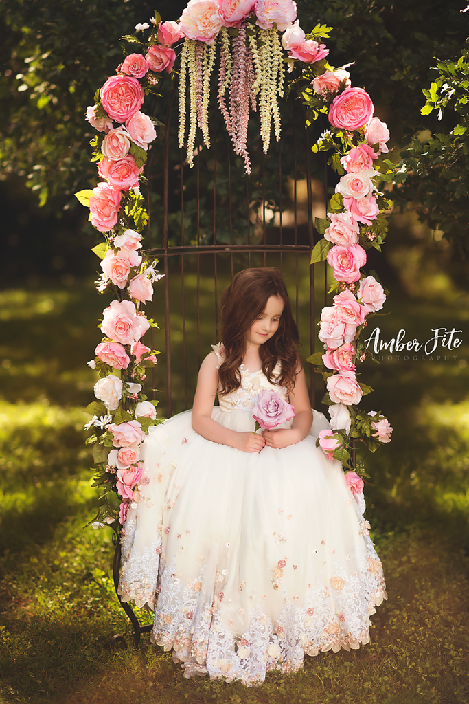 The Delilah gown is the newest addition to the Sew Trendy™ Couture line, and is the most time intensive piece that we offer. A true couture gown, the Delilah is created with 5 stunning layers of soft bridal mesh in full circles for amazing twirl and drape. The top layer is encrusted in hand made blossoms, elegant embroidered bridal lace, and champagne embroidered petals. The top is designed in a satin corset for sizing versatility, and is delicately lined with handmade flowers and embroidery. A large structured satin bow is added in back, and the gown is carefully engulfed in Swarovski crystals. This gown is truly fit for a princess. Fabulous for wedding, stylized photo sessions, and other fashion events - the Delilah is a piece of art worthy of displaying for all to see!