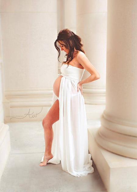 Kaleigh Gown • Sheer Chiffon Maxi Style Maternity Gown • Straight Top Bridesmaid Gown • Strapless Flowy Gown by Sew Trendy