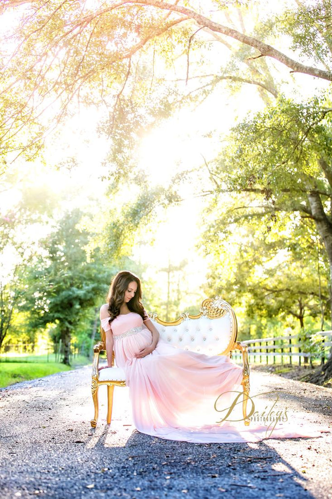 If you want yards upon yards of our beautiful, soft sheer flowing chiffon with a sweetheart top and off the shoulder sleeves, this Lexcie gown is for you. The long flowing chiffon on this gown will give your photos the wind blown look you have been dreaming of with a touch of sweet elegance. The Lexcie gown comes with a split front to show off your stunning mom-to-be's baby bump. If you want more volume, or if you are wearing this for senior photos, or just want more coverage, we have our fabulous lining options upon checkout.