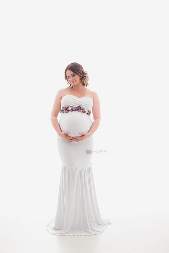 This exquisite Milena gown is form fitting and lined to the knee to show off your curves with a sweetheart neckline. It is long enough, with our soft knit fabric that composes the mermaid skirt, to spread out around your feet! This gown is also fabulous for non-maternity senior photo shoots, bridesmaids, and modeling events!