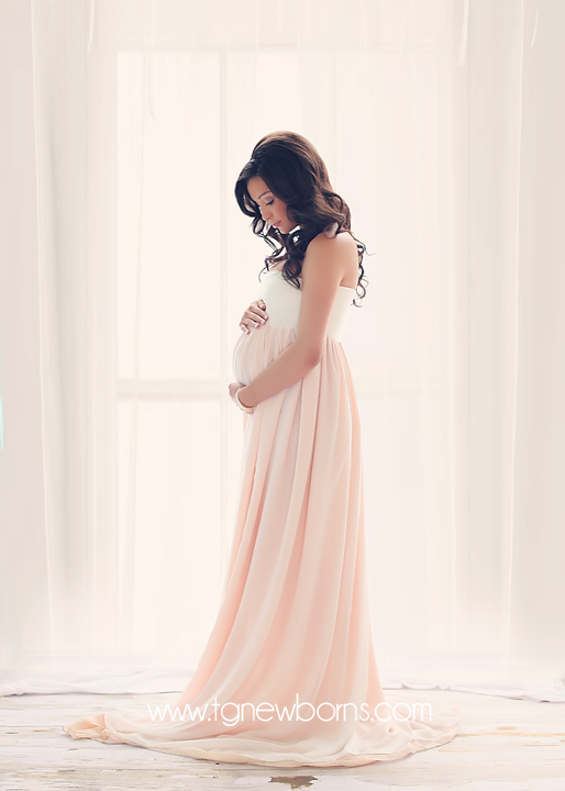 This Miley gown is a fun and beautiful chiffon gown that boasts 3 panels of our soft flowing tiered chiffon and a straight top. The 3 panels allow for an ombre (multi-color) look, of which you can choose from 2 ombre color selections. This gorgeous gown comes with a split front to show off your adorable mom-to-be's baby bump.