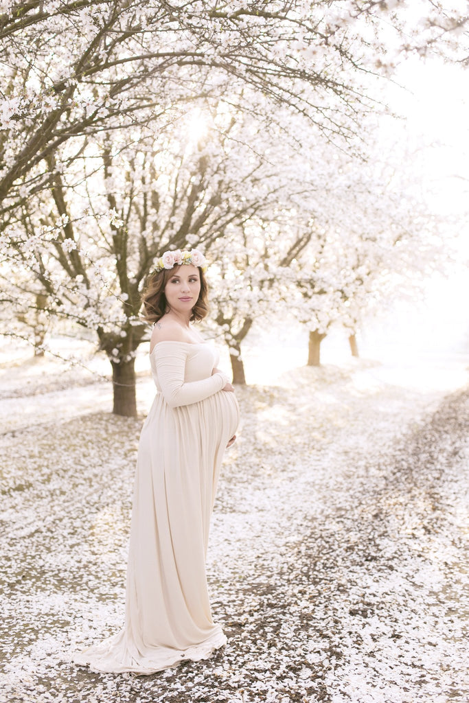 The Miriam off-the-shoulder style maternity gown brings elegant comfort to curves with fitted long sleeves, and a graceful, full-coverage, empire waist skirt.