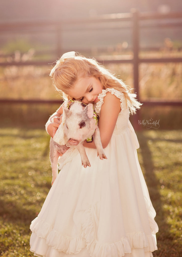 The Quincy is a classic country style lace girls gown, perfect for your next stylized photography session, wedding, or other special event. This gown is expertly handcrafted with a lace lined knit top, sweet flutter sleeves, and a low cut back. The full chiffon skirt is trimmed with ruffles and pickups for added texture. Layers of mesh give the skirt fullness, and lined with soft bridal satin for total coverage.