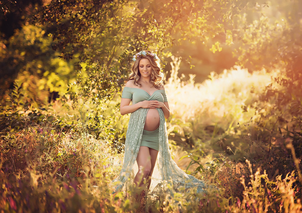 Gorgeous sweetheart style lace maternity gown with off the shoulder cap sleeves for your maternity photo shoot!  Comes standard with a split front to show off your adorable mom-to-be's baby bump, or available with no split for extra coverage. Long enough to spread out behind your model!