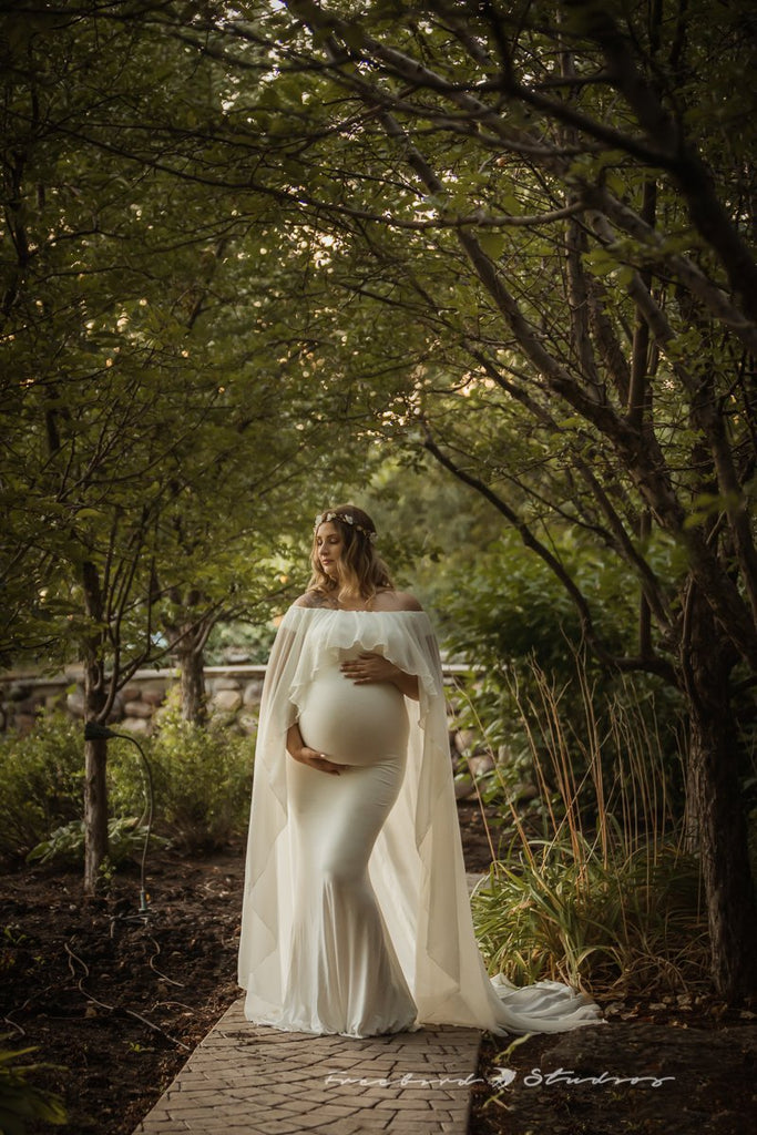 This stunning maternity gown is created with a fitted bodice in our luxe jersey knit, and an exquisite tiered chiffon flounce cape for a renaissance feel. The Isolde gown features a fitted lining to provide excellent coverage. Perfect for both maternity and non-maternity use, this gown is great for weddings, maternity photos, fashion photos, and other special events.