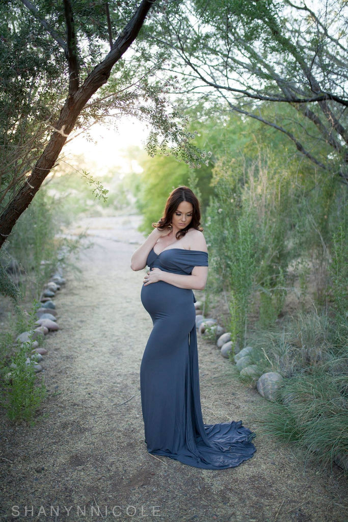 The stunning Vera gown is a slim fitted gown with an infinity top that perfectly aligns to the curves of your beautiful body. The long, soft silhouette knit fabric cascades from your body to the floor for a elegant look and feel. This gown is not only stunning for your maternity photos but is a show stopper at any event, whether it is being worn for maternity or non-maternity, such as senior photo shoots, bridesmaids, and modeling events.
